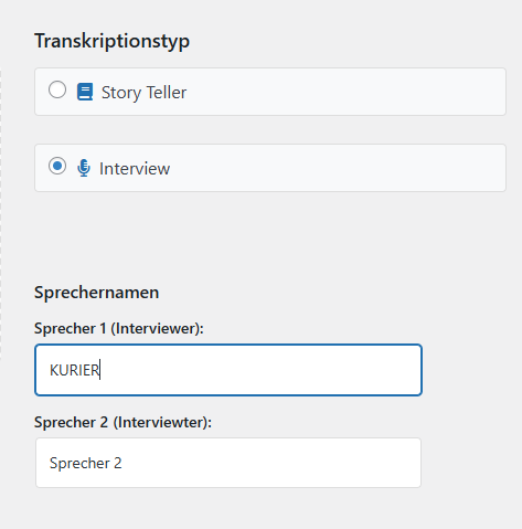 Das Transkriptions-Modul wurde um eine praktische Funktion erweitert: Bei der Auswahl von „Interview“ können jetzt benutzerdefinierte Namen für die Sprecher eingegeben werden. Anstatt der generischen Bezeichnungen „Sprecher 1“ und „Sprecher 2“ werden automatisch die eingegebenen Namen (z.B. „Interviewer“ und „Gast“) in der Transkription verwendet.